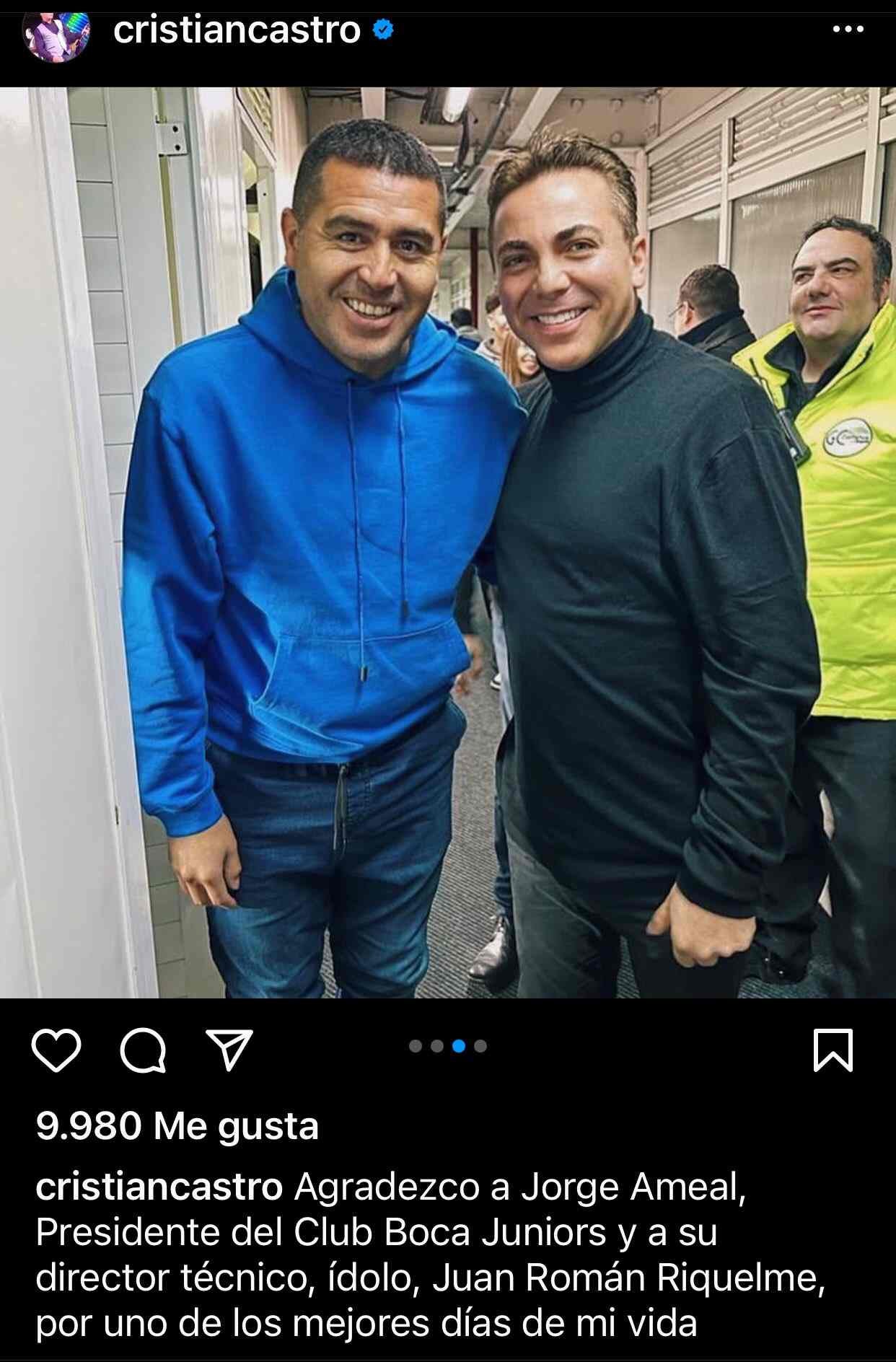 "Agradezco a Jorge Ameal, Presidente del Club Boca Juniors y a su director técnico, ídolo, Juan Román Riquelme, por uno de los mejores días de mi vida", escribió Cristian Castro en sus redes sociales, en un texto que horas más tarde fue modificado.